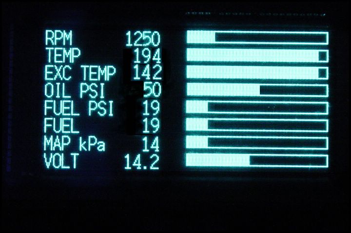 This screen shows 8 user defined BAR GRAPHS, Each graph fills from left to right as values increase. Bar Graph updates are in real-time. In this screen, 4 values come from C950 via serial port (RPM, TEMP, MAP, and VOLT) while the remaining 4 (OIL, FUEL PSI, FUEL LEVEL, and Heat Exchanger Temp) come from analog inputs. Graph positions and labels are user configurable.
