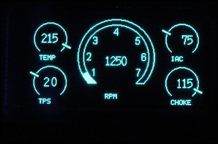 This screen shows 5 gauges in graphic dial format, Each gauge has a pointer that rotates clockwise as values increase. Large RPM dial fills clockwise as value increases. Injector pulse width, Engine temperature, Idle Air Control, Throttle Position, Choke, and RPM all come from C950 via serial port. Dial positions and labels are user configurable.